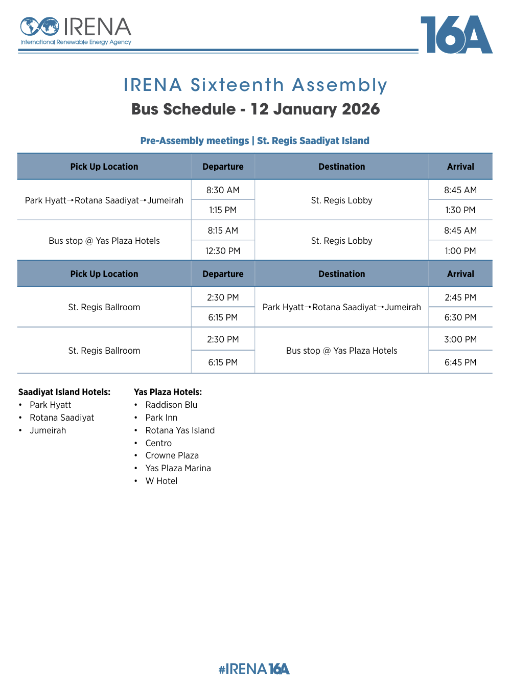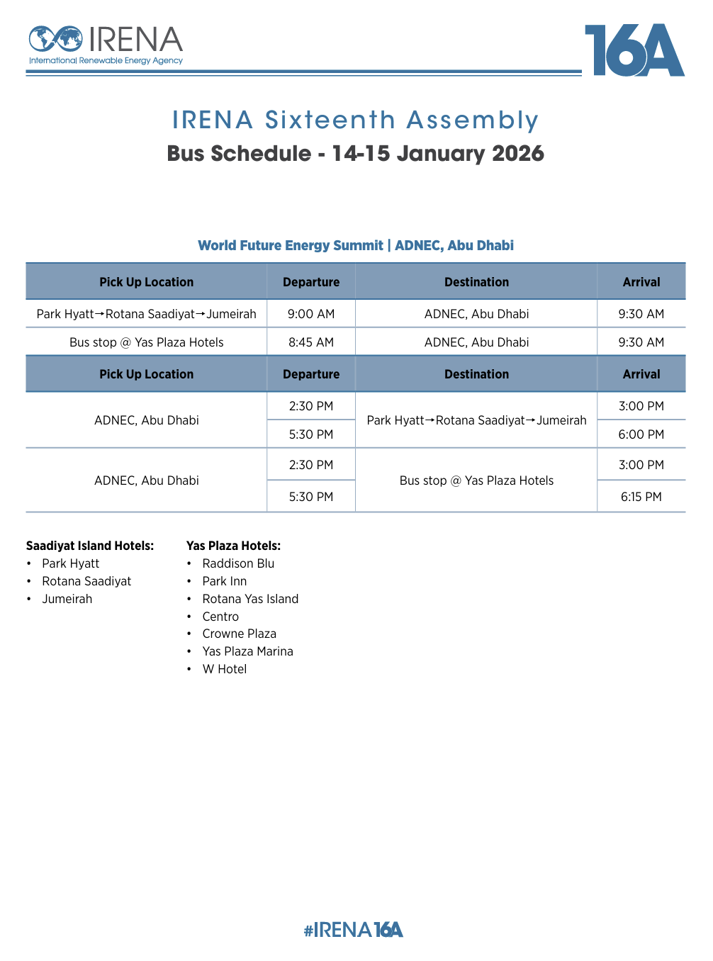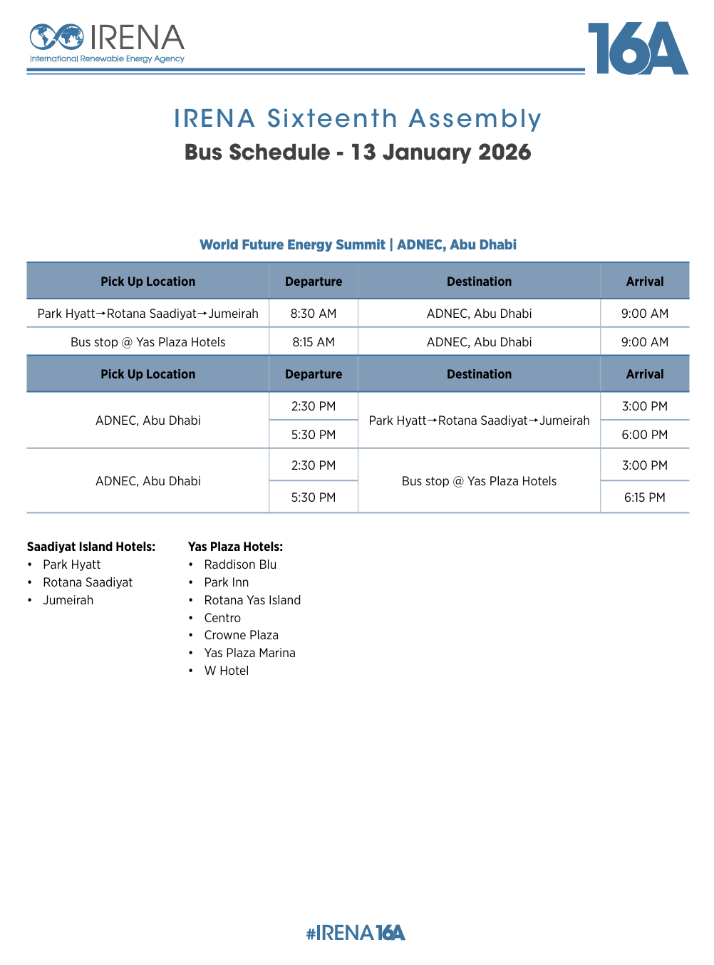 Sixteenth Session of the IRENA Assembly and IRENA at WFES Bus Schedule