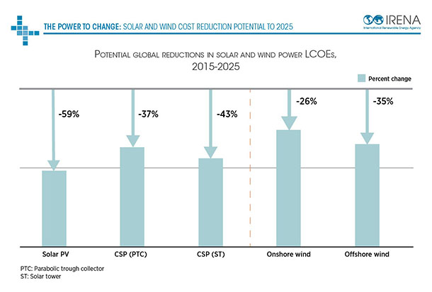 Abu Dhabi, United Arab Emirates, 15 June 2016 – The average costs for electricity generated by solar and wind technologies could decrease by between 26 and 59 per cent by 2025, according to a report released today by the International Renewable Energy Agency (IRENA). The report, The Power to Change: Solar and Wind Cost Reduction Potential to 2025, finds that with the right regulatory and policy frameworks in place, solar and wind technologies can continue to realise cost reductions to 2025 and beyond.
